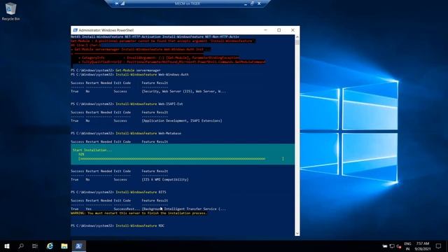 You can use below powershell commands to install SCCM Pre req (IIS etc) Get-Module servermanager Install-WindowsFeature Web-Windows-Auth Install-WindowsFeature Web-ISAPI-Ext Install-WindowsFeature Web-Metabase Install-WindowsFeature Web-WMI Install-WindowsFeature BITS Install-WindowsFeature RDC Install-WindowsFeature NET-Framework-Features -source \\yournetwork\yourshare\sxs Install-WindowsFeature Web-Asp-Net Install-WindowsFeature Web-Asp-Net45 Install-WindowsFeature NET-HTTP-Activation Install-WindowsFeature NET-Non-HTTP-Activ