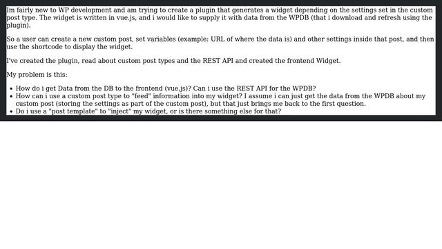 Wordpress: dynamic vue widget inside custom post Helpful? Please support me on Patreon: https://www.patreon.com/roelvandepaar With thanks & praise to God, and with thanks to the many people who have made this project possible! | Content (except music & images) licensed under CC BY-SA https://meta.stackexchange.com/help/licensing | Music: https://www.bensound.com/licensing | Images: https://stocksnap.io/license & others | With thanks to user Tom J Nowell (wordpress.stackexchange.com/users/736), user fogx (wordpress.stackexchange.com/users/171113), and the Stack Exchange Network (wordpress.stackexchange.com/questions/341988). Trademarks are property of their respective owners. Disclaimer: All information is provided "AS IS" without warranty of any kind. You are responsible for your own actions. Please contact me if anything is amiss at Roel D.OT VandePaar A.T gmail.com