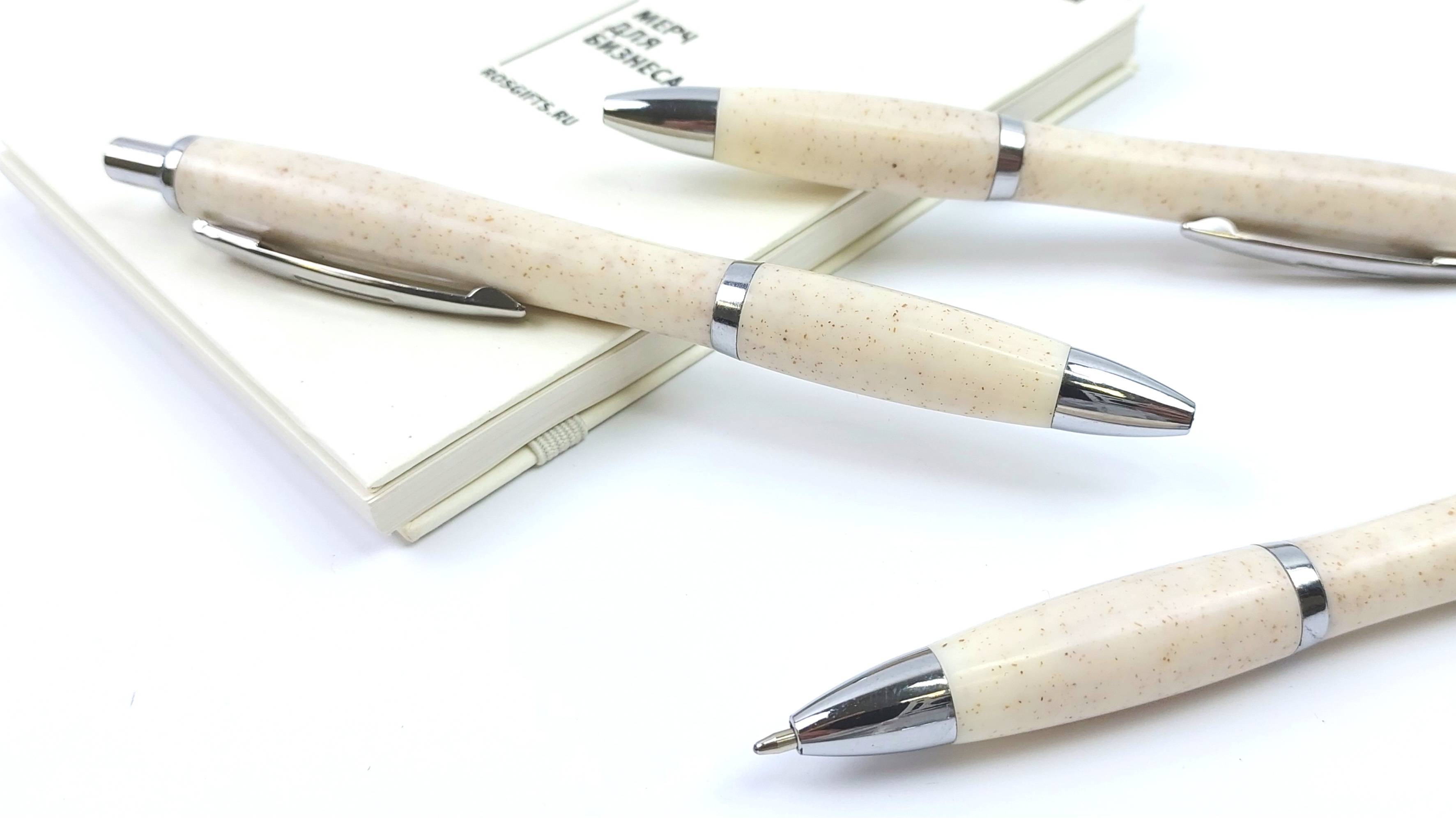 Шариковые ручки из современного эко пластика (зерноволокно + abs) - цвет натуральный. Нажимной механизм подачи стержня, у ручки синяя паста которую можно легко заменить. Минимальный заказ от 1000 штук, цены по ссылке https://rekonagrand.ru/goods/181204-150 Так же в нашем каталоге представлены эко ручки из эко материалов другие модели https://rekonagrand.ru/catalog/eko-kancelyariya продаем эко ручки в Москве, Самаре и делаем эко ручки с логотипом. Примеры можно посмотреть в портфолио https://rekonagrand.ru/catalog/portfolio и у нас можно заказать эко ручки в Казани, эко ручки с логотипом в Новосибирске - так же доставка в Красноярск, Пермь, Калуга, Саратов, Оренбург, Ульяновск и другие.