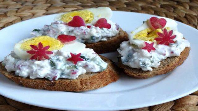 Творожно-овощной салат с яйцом на луковых тостах