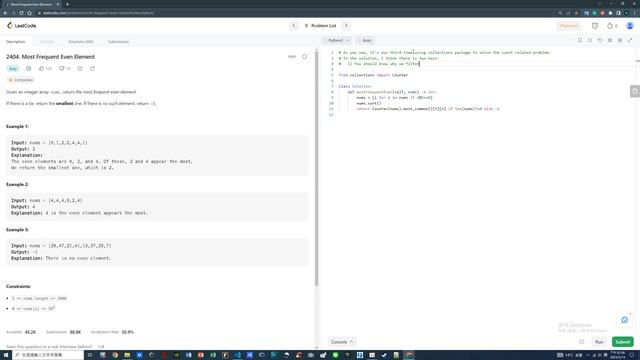 【Leetcode 54/70】2404. Most Frequent Even Element (~Easy) Use Collections.Counter.most_common again