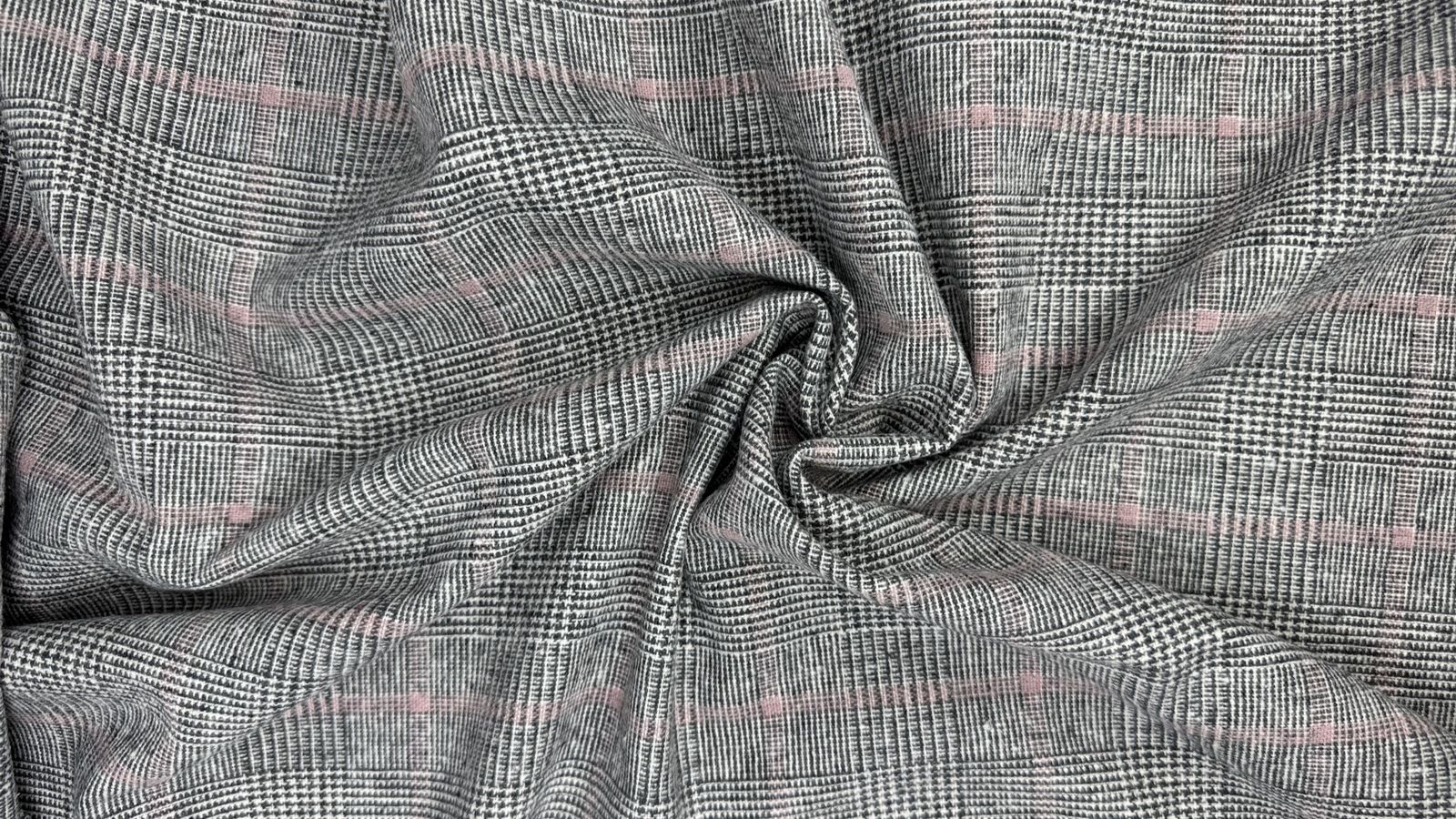 Ткань клетка гленчек цвет серо-розовый. Синтетическое плотное с плотностью 250 гр и шириной 150 см. Лицевая с минимальным ворсом, изнанка гладкая. Не тянется, учитывайте это при выборе модели. Закладывается в мягкие небольшие складки. Хорошо держит форму. Не мнется. Минимальная усадка 3%. Что шить: легкие куртки на лето, легкие тренчи, костюмы, юбки, брюки. Уход за тканью: -машинная стирка на деликатном режиме; -минимальное количество оборотов при отжиме; -сушить в расправленном виде; -утюжка на минимальном температурном режиме; -не отбеливать.