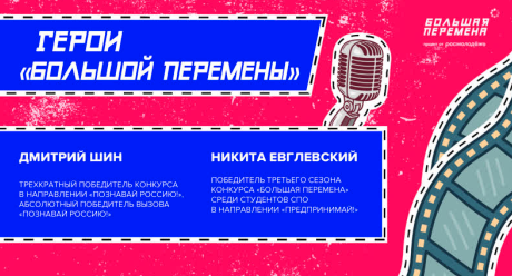Новый выпуск «героической» рубрики «Большой перемены» уже готов. «Герои «Большой перемены» по направлению «Познавай Россию!» здесь. Знакомься с ребятами и их проектами. Сегодня в выпуске: Дмитрий Шин – трехкратный победитель конкурса в направлении «Познавай Россию!», абсолютный победитель вызова «Познавай Россию!» Никита Евглевский – победитель третьего сезона конкурса «Большая перемена» среди студентов СПО в направлении «Предпринимай!», автор проекта «Город Рыльск. История и достопримечательности», который знакомит молодежь с культурным наследием города, его историей и историческими личностями. #БольшаяПеремена #ПознавайРоссию #ГероиБП