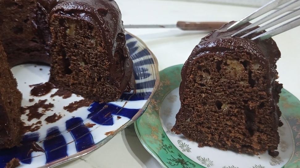 Банан 2шт (200гр) яйца 3шт сахар 100гр ванилин сливочное масло 150гр мука 100гр какао 30гр разрыхлитель 6гр соль щепотка При 170°С 35-45 минут до сухой зубочистки глазурь шоколад 100гр молоко 50мл