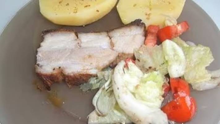 Картофель слив.масло Форель Свиная грудинка 5-6ст.л раст.масла 2 ч.л соли 1ч.л сладкой паприки 1ч.л чёрного молотого перца 1ч.л сухого чеснока 1ч.л мёда 1ч.л горчицы 150 градусов, 100 минут