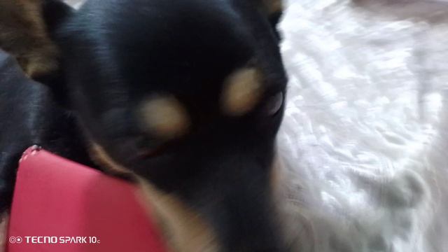 Моя собака плюшка грызёт красный чехол
