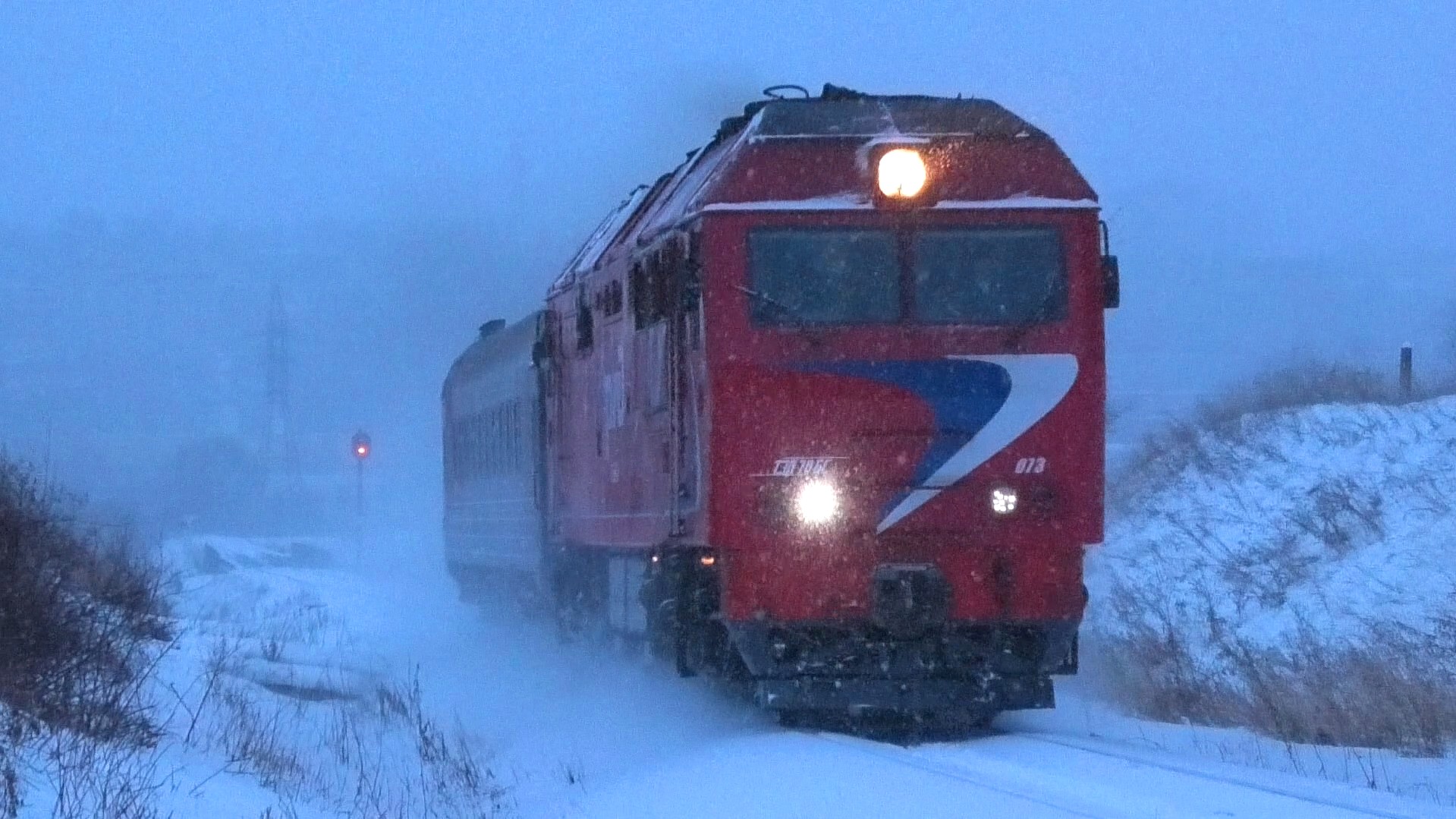 Тепловоз ТЭП70БС-073 с пригородным поездом №6361 Воткинск - Ижевск следует по перегону Воткинск - Кварса. Горьковская ЖД. Удмуртская Республика, Россия. Приписка: ТЧЭ-15 Агрыз. 27.12.2020