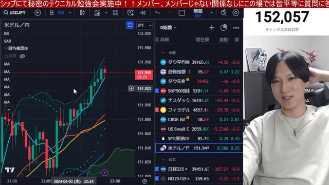 4/3、日本株まだ下がるんか⁉️下落サイン点灯で日経平均387円安。金利急騰でドル円152円の攻防。米国株、ナスダック、半導体株にも売り圧力。仮想通貨ビットコインも弱い。