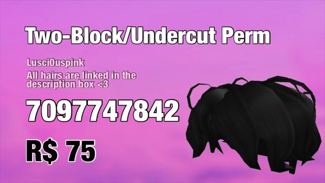 .。*゚+.*.。 ???? ??! ゚+..。*゚+ Navy Blue Anime Hair: 80 Robux Code:5891052854 Link:https://www.roblox.com/catalog/5891052854/Navy-Blue-Anime-Hair Pompadour in Shining Black: 100 Robux Code:5132115339 Link:https://www.roblox.com/catalog/5132115339/Pompadour-in-Shining-Black Black Messy Anime Hair: 79 Robux Code:5508722522/ Link:https://www.roblox.com/catalog/5508722522/Black-Messy-Anime-Hair Cool Boy Hair: 79 Robux Code:5644883846 Link:https://www.roblox.com/catalog/5644883846/Cool-Boy-Hair Beautiful Hair for Beautiful People: 95 Robux Code:16630147 Link:https://www.roblox.com/catalog/16630147/Beautiful-Hair-for-Beautiful-People Black Fluffy Messy Boy Hair: 75 Robux Code:7067588586 Link:https://www.roblox.com/catalog/7067588586/Black-Fluffy-Messy-Boy-Hair Black Short Messy Anime Hair: 80 Robux Code:7063885746 Link:https://www.roblox.com/catalog/7063885746/Black-Short-Messy-Anime-Hair Black Anime Style Hair: 75 Robux Code:7104671488 Link:https://www.roblox.com/catalog/7104671488/Black-Anime-Style-Hair Black Messy Side Swoop: 75 Robux Code:7107560513 Link:https://www.roblox.com/catalog/7107560513/Black-Messy-Side-Swoop Black Two-Block/Undercut Perm: 75 Robux Code:7097747842 Link:https://www.roblox.com/catalog/7097747842/Black-Two-Block-Undercut-Perm Black Cool Boy Wavy Curtain Undercut: 75 Robux Code:7097787052 Link:https://www.roblox.com/catalog/7097787052/Black-Cool-Boy-Wavy-Curtain-Undercut Black Main Character Full Fringe: 75 Robux Code:7168540174 LInk:https://www.roblox.com/catalog/7168540174/Black-Main-Character-Full-Fringe Black Fluffy Mullet: 75 Robux Code:7145036730Link:https://www.roblox.com/catalog/7145036730/Black-Fluffy-Mullet Black Side Sweep Hair: 70 Robux Code:5920359974 Link:https://www.roblox.com/catalog/5920359974/Black-Side-Sweep-Hair Black Messy Bed Hair: 80 Robux Code:6594672133 Link: https://www.roblox.com/catalog/6594672133/Black-Messy-Bed-Hair Black Side Fringe: 80 Robux Code:6473406100 Link:https://www.roblox.com/catalog/6473406100/Black-side-fringe Black Swept Hair: 80 Robux Code:6413085241 Link:https://www.roblox.com/catalog/6413085241/Black-Swept-Hair Black Overgrown Hair: 80 Robux Code:6275661250 Link:https://www.roblox.com/catalog/6275661250/Black-Overgrown-Hair Black Cat Ears Hairstyle: 85 Robux Code:7141674388 Link:https://www.roblox.com/catalog/7141674388/Black-Cat-Ears-Hairstyle Shy Anime Hair: 70 Robux Code:6811919465 Link:https://www.roblox.com/catalog/6811919465/Shy-Anime-Hair Wavy Messy Boy Hair in Black: 75 Robux Code:7028744840 Link:https://www.roblox.com/catalog/7028744840/Wavy-Messy-Boy-Hair-in-Black Floofy Black Hair: 65 Robux Code:6413422927 Link:https://www.roblox.com/catalog/6413422927/Floofy-Black-Hair Messy Boy Hair in Black: 75 Robux Code:6823338112 Link:https://www.roblox.com/catalog/6823338112/Messy-Boy-Hair-in-Black Black Male Bun: 125 Robux Code:5234778895 Link:https://www.roblox.com/catalog/5234778895/Black-Male-Bun-Hair ?: Hey Pinkies! Thank you for checking out my video. As always, remember to SUBSCRIBE for more content in the future, and please give my video A BIG THUMBS UP so I know you enjoyed it! ⭐️SUBSCRIBE TO MY CHANNEL HERE: http://www.youtube.com/c/Lusci0uspink ?JOIN MY GROUP: https://www.roblox.com/groups/7935897/Lusci0uspinks-Pinkies#!/about ?Most of my relaxing background music is from this channel called LuKremBo: https://youtu.be/SHpQ77wDfYg ?Bread music Prod. by Lukremb? --------?FAQ?---------- What do you record and edit your videos with? I record with QuickTimePlayer and edit w/ iMovie. What other editing apps do I use? Picsart and Phonto Can you friend me? I do not friend everyone, but you can follow me and message me anytime! I’m only having family and close friends on my friends list. When do you upload? I upload every Monday/Friday and sometimes on Wednesday! I upload other days when I am free. What do I call my subs? Pinkies My Roblox Profile:https://www.roblox.com/users/996180150/profile Instagram:https://www.instagram.com/lusci0uspink/ ?Copyright disclaimer- I do NOT own any of the music used. Under Section 107 of the Copyright Act 1976, allowance is made for 'fair use' for purposes such as criticism, comment, news reporting, teaching, scholarship, and research. Fair use is a use permitted by copyright statute that might otherwise be infringing. Non-profit, educational, or personal use tips the balance in favor of fair use.
