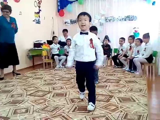 Мучаев Бату (в центре) вместе с друзьями Хулхачиевым Лиджи и Очировым Анджой танцуют "Яблочко". Мероприятие посвящено Дню Победы 9 мая. Детский сад "Торhа", п. Ики-Бурул, Калмыкия. 5 мая 2017