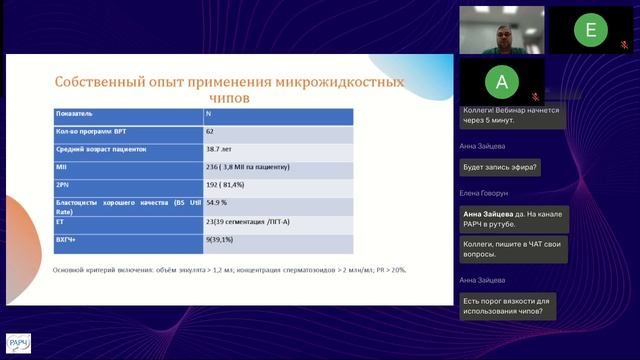 Тема вебинара: "Использование микрофлюидики для обработки спермы в программах ВРТ: методики, показания, результативность". Лектор: Давлетшин Тимур Индусович, старший эмбриолог Клиника NGC г. Уфа. Анонс: Применение микрофлюидных чипов для обработки эякулята в программах ВРТ на территории РФ становится шире с каждым месяцем. Наши спикеры поделились своим опытом применения этой технологии и ответили на вопросы слушателей - как тех кто уже применяет чипы, так и тех кто еще не имеет опыта работы с ними. Модераторы: Бачурин Алексей Владимирович, член Совета РАРЧ, член Координационного совета секции «Клиническая эмбриология» РАРЧ, ведущий эмбриолог клиники "Новая жизнь", заместитель генерального директора по качеству, г. Москва.