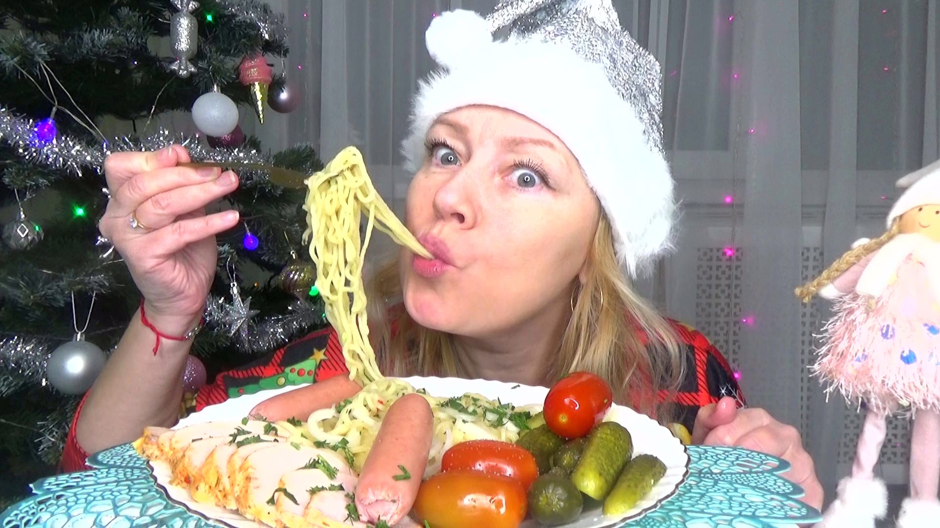 Мукбанг лапша чан рамен, сосиски и курица су-вид, соленья. Еда.