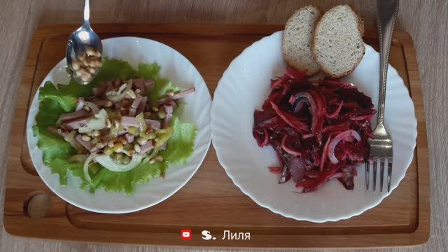 Салат с селедкой: отварная или запеченная свекла 1 шт. яблоко зеленое 1 шт. селедка 1 шт. лук репчатый 1 шт. Для заправки: масло растительное нераф. 2-3 ст.л. лимонный сок 1 ст.л. горчица 1 ч.л. Салат с говядиной: говядина 200 г огурцы соленые 2 шт. лук репчатый 1 шт зеленый горошек маленькая банка Для заправки: масло растительное 2-3 ст.л. розмарин щепотка, черный перец мол. 1,3 ч.л. чеснок 1 зуб. ПРИЯТНОГО!