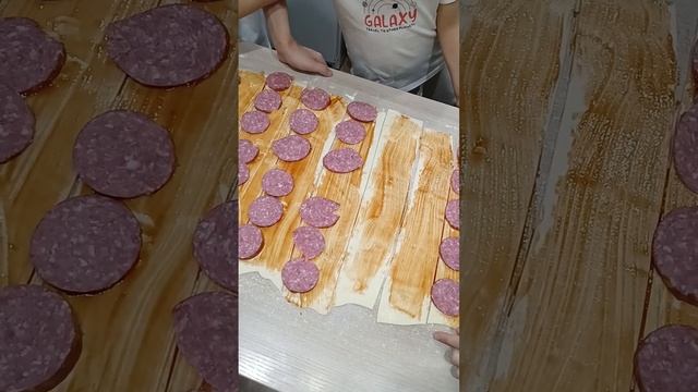 Ингредиенты: тесто слоеное 400 г (2 пластинки) кетчуп колбаса 150 г сыр 200 г соленые (маринованные)огурцы 1-2 шт яйцо 1 шт Приятного аппетита!