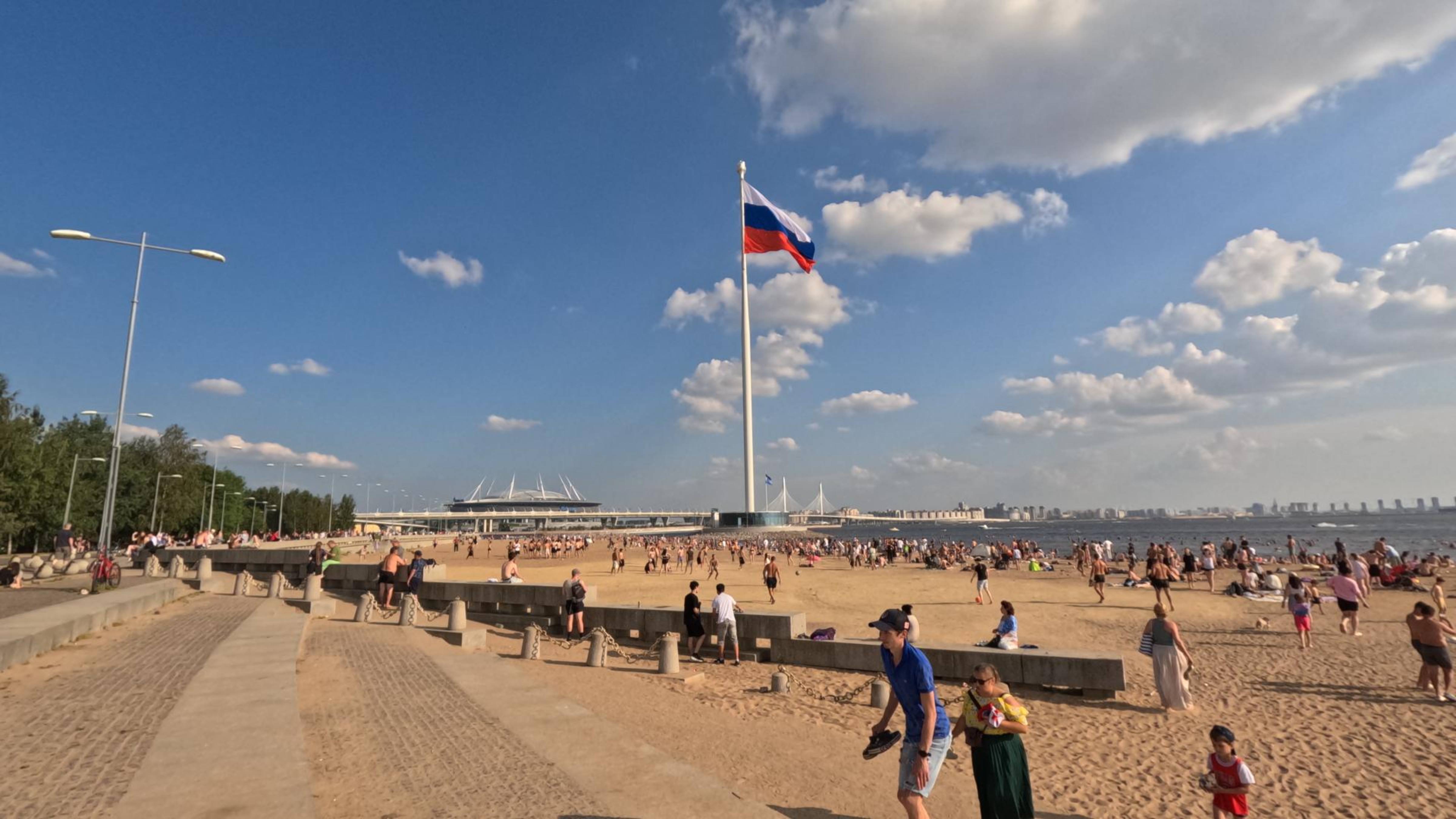 Прогулка от Газпром Арены через Яхтенный мост и парк 300-летия Петербурга к пляжу. Флагштоки с историческими флагами России и башня Лахта-центра.