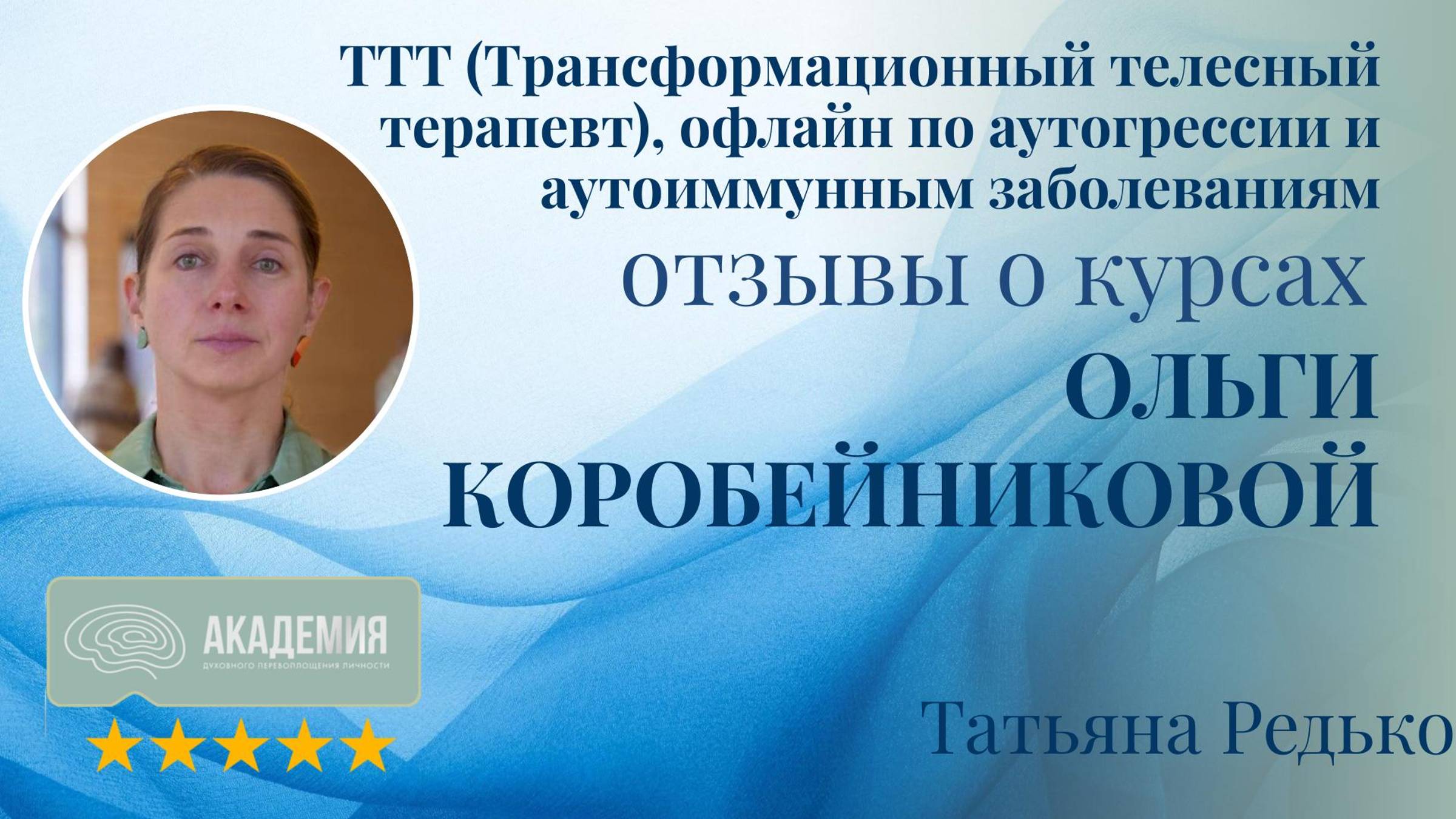Отзывы о курсе Ольги Коробейниковой: "Трансформационный телесный терапевт (ТТТ)", офлайн по аутоагрессии и аутоиммунным заболеваниям - Курсы: ТТТ (Трансформационный телесный терапевт), офлайн по аутоагрессии и аутоиммунным заболеваниям Татьяна подчеркивает, что Ольга — это мастер, который глубоко раскрывает процессы, происходящие в теле и душе, давая полноценное понимание их взаимосвязей. - Результат Курс дал Татьяне глубокие знания, которые она теперь может использовать в своих практиках и профессиональной деятельности. Отзывы Татьяны показывают, что курсы Ольги Коробейниковой способствуют развитию и обогащению профессиональных навыков, раскрывая новые аспекты самореализации. #самореализация