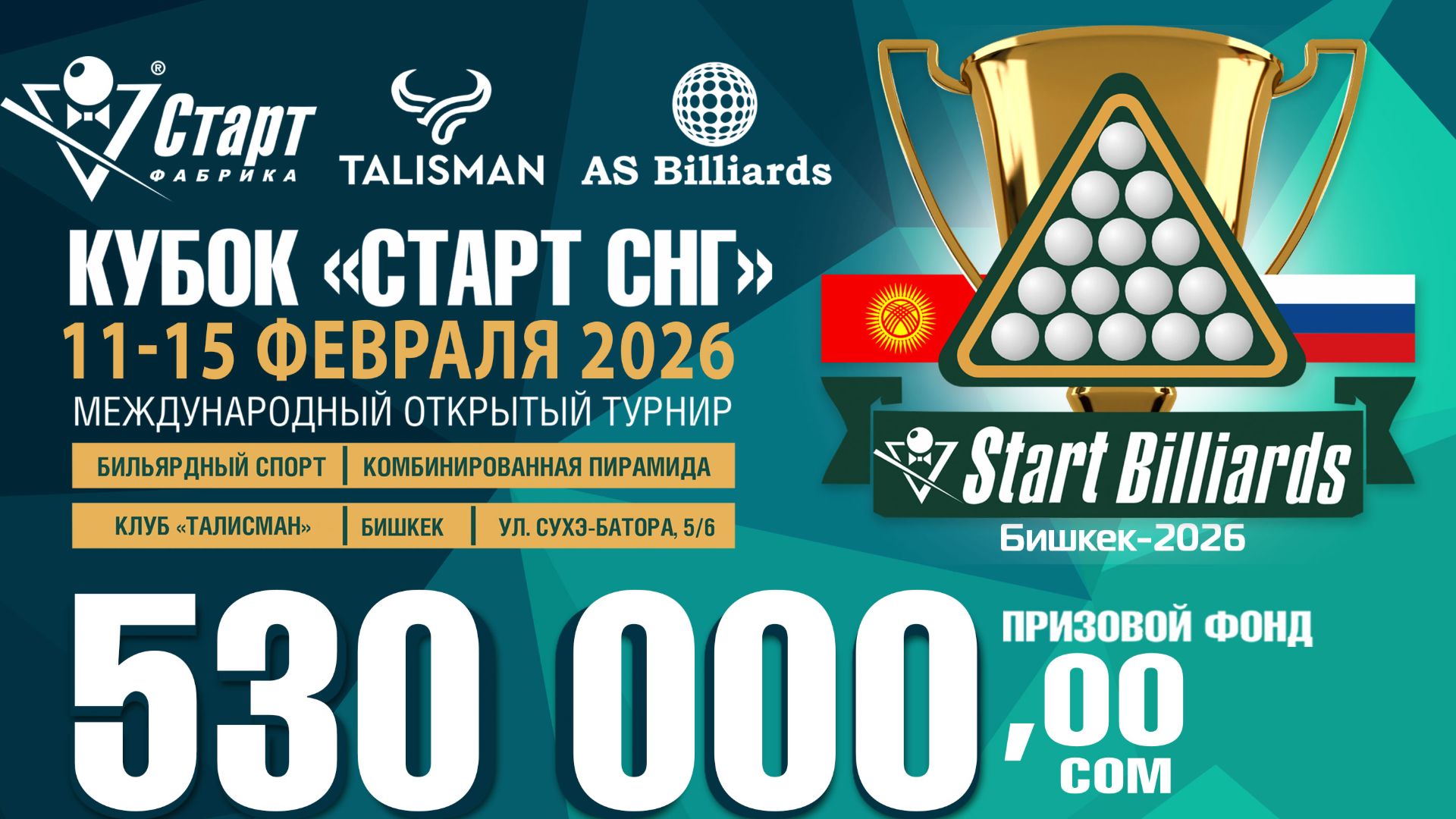 У Фабрики «Старт» богатая история проведения собственных турниров. Уже два года подряд Кубок «СТАРТ СНГ» с размахом проходил в столице Узбекистана, собирая под свои знамёна сильнейших игроков и восторженных зрителей. Этот успех вдохновил нас на расширение географических границ — в 2026 году эстафета Кубка «СТАРТ СНГ» будет передана гостеприимной столице Кыргызстана! Фабрика «Старт» совместно с Бильярдным Клубом «Талисман» и официальным дилером AS Billiards объявляет о проведении международного открытого турнира — Кубок «СТАРТ СНГ» 2026. Знаковым признанием статуса соревнования стало его включение в официальный Календарный план соревнований МКП, что подчеркивает высокий уровень организации и спортивной значимости события. С 11 по 15 февраля Бильярдный Клуб «Талисман» станет эпицентром спортивных страстей и мастерства. Сердце бильярдной жизни забьётся в Бишкеке! Мы приглашаем всех спортсменов и истинных ценителей бильярда вступить в честную и захватывающую борьбу за титул и внушительный призовой фонд, который составляет 530 000 сом! Это не просто соревнование — это масштабный спортивный праздник, цель которого объединить игроков из разных стран и культур на одной площадке, в дружеской, но напряжённой конкурентной борьбе. Присоединяйтесь, чтобы вместе написать следующую страницу истории нашего турнира! Сроки и место проведения Кубка «СТАРТ СНГ» 2026 Даты проведения: с 11 по 15 февраля 2026 года. Место проведения: Бильярдный клуб БК «Талисман» Кыргызстан, г. Бишкек, ул. Сухэ-Батора, 5/6 Дата приезда участников: 11 февраля 2026 года Регистрация участников: 11 февраля 2026 года с 16:00 до 19:00 Жеребьевка участников: 11 февраля 2026 года в 19:30 Церемония открытия турнира: 12 февраля 2026 года в 11:00 Начало игр: 12 февраля 2026 года в 11:30 Церемония награждения и закрытия: 15 февраля 2026 года по окончании финальных встреч Дата отъезда участников: 16 февраля 2026 года Быть в курсе актуальных турнирных новостей вы сможете на нашем сайте: https://fabrika-start.ru/!