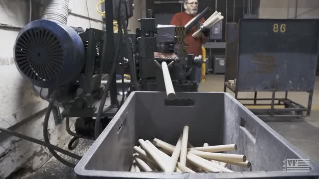 Изготовление палочек Vic Firth 5A: обработка дерева, шлифовка, балансировка и нанесение логотипа.
