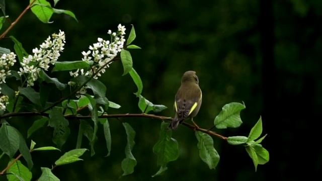 Зеленушка на ветке черемухи