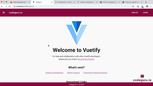 Hello codeguru's welcome back. In this video we will discuss about how to add navigation to our single page application using vue router component and the proceed with adding vuetify js framework to our web application. Post that we will customise our application using vuetify components. Finally we will deploy our changes into our dev environment and test the results, once we are happy with our test results we will merge our changes into our master branch which is our production branch and deploy those changes into production environment using continuous deployment pipelines. We hope you enjoyed this video. Please do not forget to provide your feedback or any topic suggestion in the below comments section. you can also find the playlist of all the video for this web service on the following URL https://www.youtube.com/watch?v=HgpVgFdBS2E&list=PLAl8os33KyOVD4asd0Sf7BcuE41fu7i6c You can also connect with us on our facebook page at blow link: https://www.facebook.com/Codeguruio-3037410576272816/