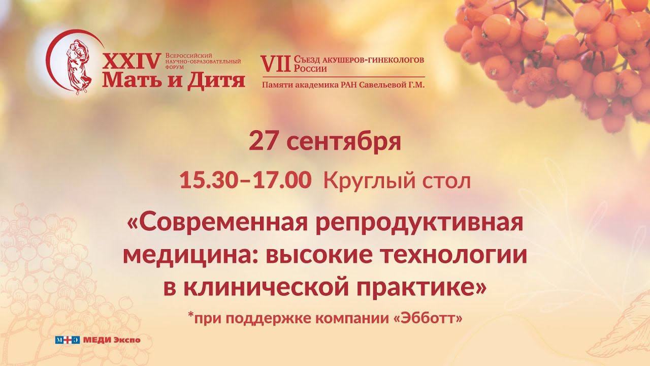 Председатели: Серов В.Н., Тетруашвили Н.К., Назаренко Т.А. В рамках XXIV Всероссийского научно-образовательного форума «Мать и Дитя – 2023» памяти академика РАН Савельевой Г.М. и VII Съезда акушеров-гинекологов России 27–29 сентября 2023 года Крокус Экспо Официальный сайт: https://mother-child.ru Программа: https://mediexpo.ru/fileadmin/user_upload/content/program/md2023--program.pdf Vk: https://vk.com/medimd2022 Ok: https://ok.ru/group/56673799700546 Telegram: https://t.me/mediexpo