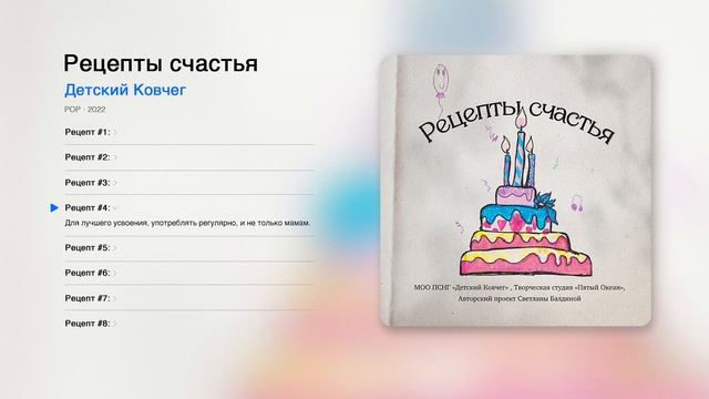 Рецепт счастья N4: Для лучшего усвоения, важно употреблять регулярно, и не только мамам. Солисты: Юля и Лиза Шестаковы. Гитара: Константин Балдин, Александр Данилов. Как приходят идеи? Иногда так: нам 25 - это серьёзный Юбилей! Конечно, пора подвести итог - итог наших надежд и свершений, любви и признательности, наших слезинок и смешинок: детских и совсем взрослых. Потом собрать всех обитателей нашего «Детского Ковчега»:сотрудников, детей, выпускников, соседей и, конечно, старых друзей, и такой компанией разучить и спеть о том, что для нас СЧАСТЬЕ. Принимайте наши «РЕЦЕПТЫ СЧАСТЬЯ» «Вишня» - стихотворение Михаила Исаковского, прочитанное ещё в детстве, стало для меня сразу песней - лейт- мотивом моих поступков. Все остальные слова и музыка этого альбома написаны мной. Они откроют вам сердца и чувства нашего большого и дружного коллектива единомышленников…,я на это очень надеюсь» - Светлана Балдина #детскиепесни #обнимашки #детскийковчег #детисироты #рецептысчастья #счастье