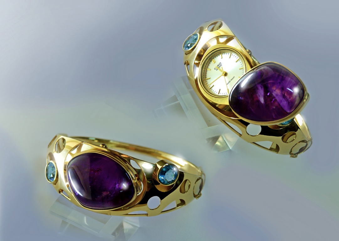 Авторская работа: браслет-часы Материалы: золото 750 пробы, аметист, топаз, часовой механизм Casio Изготовлено в 2010 году Единственный экземпляр Частная собственность