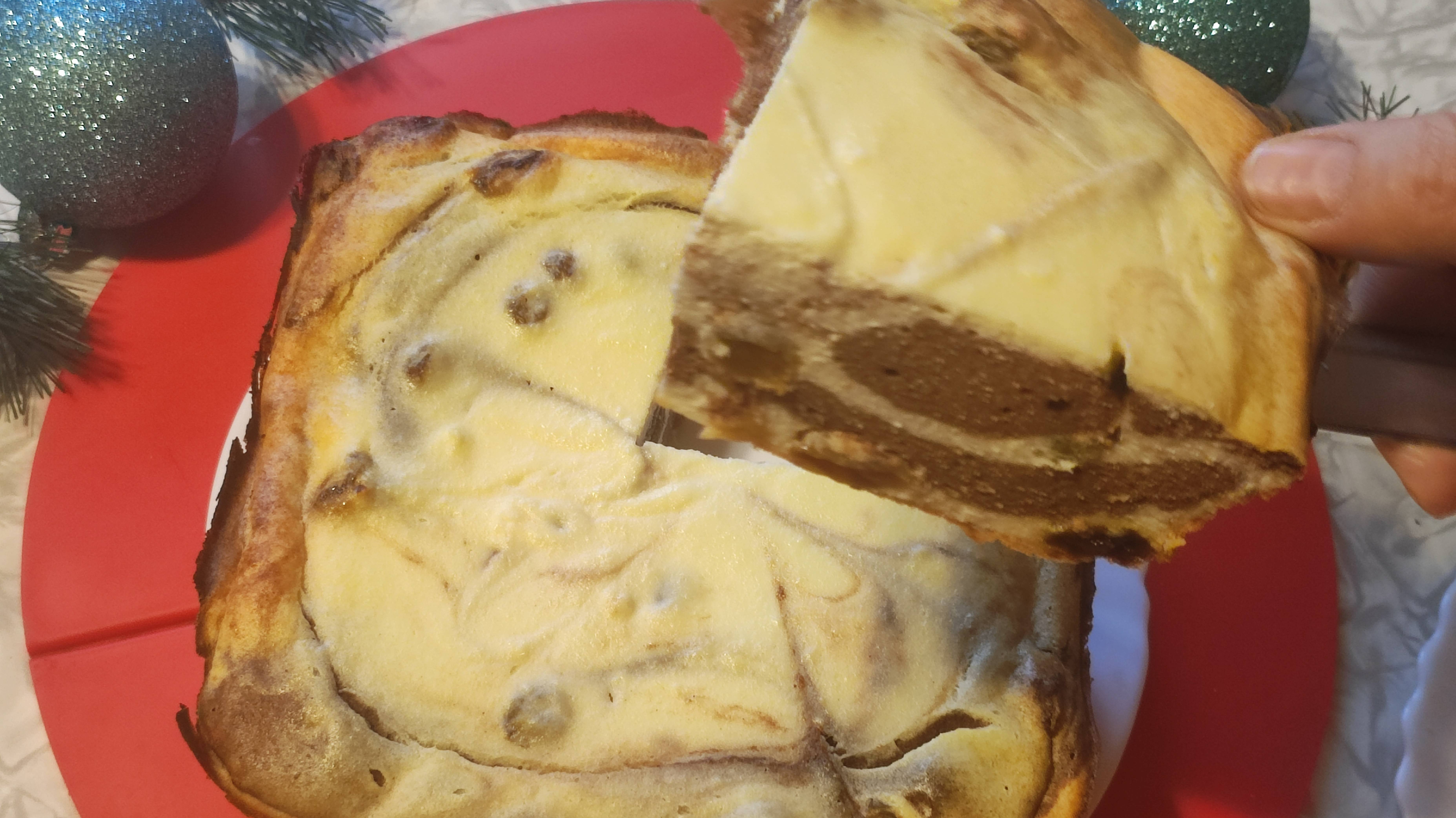 СУПЕР КУХНЯ! Нежный творожный десерт. Быстро и просто. Двухцветная творожная запеканка с изюмом -Всем привет! Готовлю нежный творожный десерт. Быстро и просто. -заливаю 150 грамм изюма кипятком -250 грамм творога пропускаю через блендер, добавляю в творожный сыр 250 грамм -2 яйца, 2 столовые ложки крахмала, ванилин, 100 грамм сахара (у меня 2 столовые ложки) -делю тесто на 2 равные части, в одну добавляю изюм, в другую 2 столовые ложки какао -форму смазываю сливочным маслом, выкладываю поочередное белое и шоколадное тесто, шпажкой наношу рисунок -Подпишитесь, пожалуйста, это поможет продвижению канала! Спасибо!! ссылка на аккаунт: https://rutube.ru/channel/35919670/