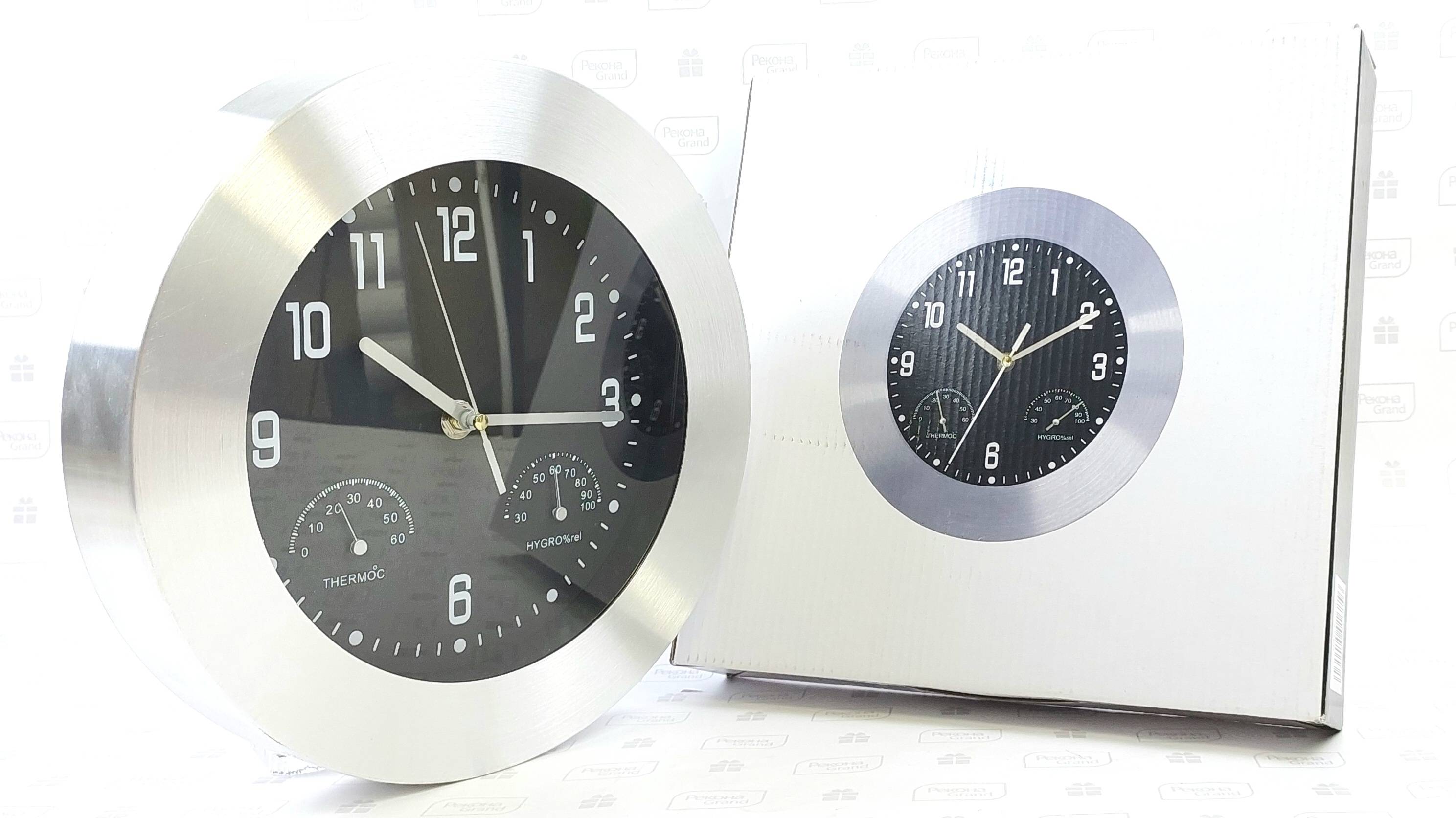 Настенные алюминиевые часы с термометром, гигрометром и с круглой широкой рамкой. Оптовый заказ от 50 штук цены по ссылке https://rekonagrand.ru/goods/401220 Красивые, серебристые металлические настенные часы с логотипом это престижно, стильно и эффектно. Фирменные настенные часы с логотипом можно дарить клиентам и партнерам. Так же настенные часы с логотипом можно дарить сотрудникам компании. Настенные алюминевые часы возможно будут Вашим идеальным подарком. Купить настенные часы оптом можно от 50 штук с поставкой под заказ. Различная сувенирная продукция в Москве со склада и под заказ https://rekonagrand.ru/catalog Большой выбор, хорошие остатки, быстрая отгрузка. Нанесение логотипов от 3-5 дней. Примеры нанесения в портфолио https://rekonagrand.ru/catalog/portfolio