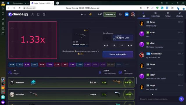в данном видео я начинаю свой путь к крутым скинам, начал я с 3.7 долларов или 300 рублей, в последующих видео будем преумножать наш балланс и двигаться дальше к своей цели:) сайт на котором я играю https://chance.gg/ru/ref/sharp реферальный код на 0.5 долларов sharp
