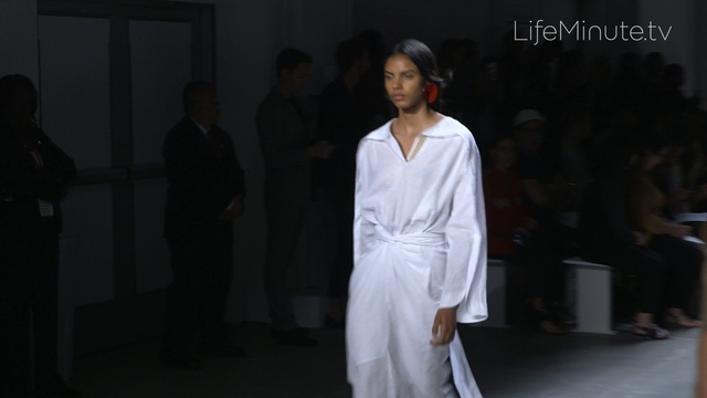Michael and Nicole Colovos were creative directors at Helmut Lang for eight years, and their experience and flair shows in their new collection, which Michael describes as "a modern, futuristic, bizarre and layered landscape with texture and pattern." Dresses layered over pants, dark rinse jeans, asymmetric shirt dresses and leather sweatshirts keep the look minimal but arty. Hairstylist guru Odile Gilbert created a "cool look" with her hands (no brushing) and makeup artist Chantel designed a no-makeup visage with a flash of color.