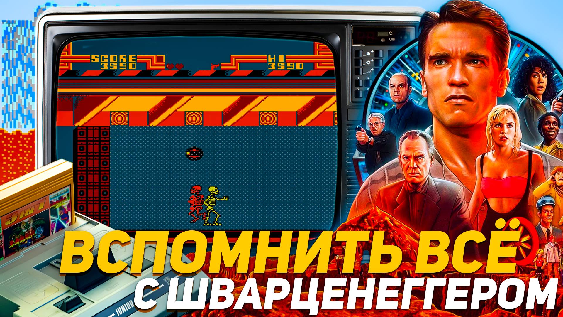 Погрузитесь в мир культовой платформенной аркады “Вспомнить всё” на Dendy, основанной на одноимённом фильме с Арнольдом Шварценеггером. В этом захватывающем видео вы увидите, как мускулистый главный герой прыгает и отбивается от врагов, используя кулаки и оружие. Игра насыщена отсылками к знаменитым сценам фильма. Например, первый босс – это “жена”, и чтобы победить её, нужно пригнуться во время стрельбы, отобрать пистолет и нокаутировать её, прежде чем подоспеет подмога. Также вы увидите, как Арни проходит через марсианскую таможню, где рентгеновские лучи создают иллюзию, что отстреливается ходячий скелет.