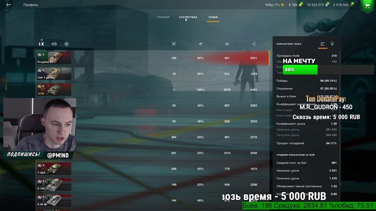 Загляни к Папаньке) - https://youtu.be/DTC0j-J3ilU Поддержать канал или задать вопрос - https://www.donationalerts.com/r/pm1nd https://donatepay.ru/don/pm1nd ✔️Через донат можно не только задать вопрос, но еще и: - прокатить определенный танк - 152р - детальный чек статы с рекомендациями в конце стрима - 150р. Сразу после боя - 300р. - поставить музыку на стрим - 200р - взвод на пару каток (обычно 3, если есть очередь) - 200р - интересные выполнимые (!!!) челленджи приветствуются Для тех кто действительно хочет помочь: - удалить мне танки на неделю - 100 000р - приехать в ваш город (РФ) и удалить танки ВАМ (под ключ со всех устройств) - 150 000р Вступить в семью интеллигентных танкистов или просто спонсорка (смайлы + выделение в чате + бонусы + ты помогаешь ютубу продвигать мой канал очень сильно) - https://www.youtube.com/channel/UCmKYhDzvo9DrX2em0AOSQJA/join ПИАР По вопросам, писать - PM1ND@hmd.one Все подряд не рекламирую! Только качественные каналы (!) На стриме или ролике можно разместить рекламу клана ПОЛЕЗНОСТИ ДЛЯ ТАНКИСТОВ Шпаргалка Танкиста - https://cutt.ly/nQwlwOz Топ Годных Премов - https://cutt.ly/mQwlqs9 Реплеи слать сюда - pm.blitzreplay@gmail.com Мой второй канал по Большим танкам, в будущем ТКМ - https://www.youtube.com/channel/UCkX7Sy9t3DSYa1V6u441HbQ Обучение по картам - https://www.youtube.com/channel/UCD7aNsZhb79WpRd4RNh5X0A ➖➖➖➖➖➖➖➖➖➖➖➖➖➖➖➖➖➖ КУДА СТОИТ ПОДПИСАТЬСЯ ИНСТАГРАМ (отвечаю в ЛС) - https://www.instagram.com/pm1nd Группа ВК (вступаем) - https://vk.com/pm1nd Телеграм PM1ND - https://t.me/pm1nd Страница ВК (добавляемся в друзья) - https://vk.com/id10179989 Discord - https://discord.gg/vDNnXh6 ➖➖➖➖➖➖➖➖➖➖➖➖➖➖➖➖➖➖ ПРОЧЕЕ Играю с iPad Pro 11" 2018 64gb. Характеристики ПК есть в инстаграме. В игре бан чата, поэтому не могу ответить. :( Стримлю через OBS и X-Mirage. Виджет статы - https://widget.pythonanywhere.com/ ➖➖➖➖➖➖➖➖➖➖➖➖➖➖➖➖➖➖ Теги: #стрим #wotblitz #вотблиц #wot #WorldOfTanksBlitz #WorldOfTanks #PM1ND