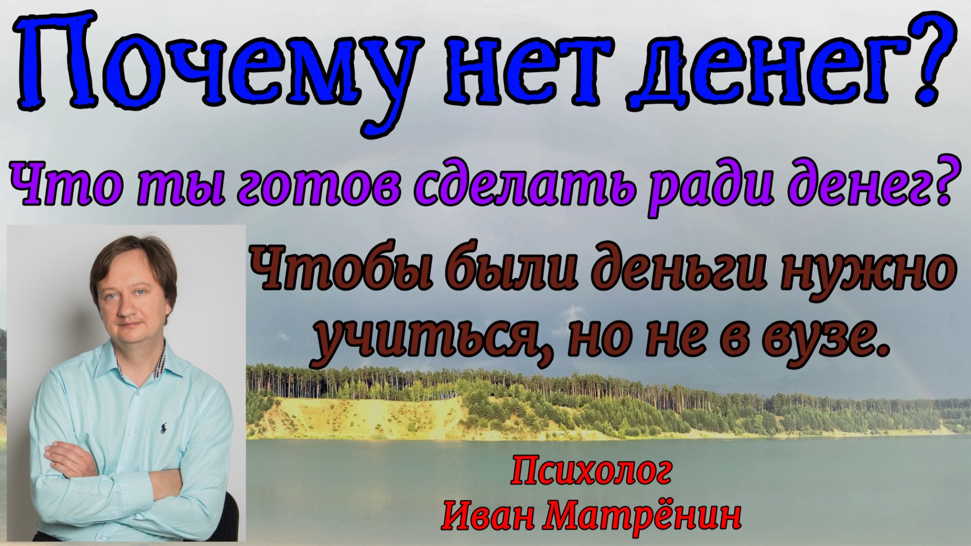 В этом фрагменте видео часть передачи на радио, где мы обсуждали в эфире тему денег. Я рассказываю о том, что часто люди хотящие деньги совсем не готовы «за это платить», то есть прилагать какие-то усилия. А что за усилия то? Учиться надо с деньгами обращаться. А учиться этому нужно не в вузе. А где? Подробнее, в этом видео. Приятного просмотра! Также можете смотреть это и другие видео у меня в аккаунте Instagram - https://www.instagram.com/sem.psiholog/ в IGTV! Там много текстов и видео на эту и другие темы по психологии и отношениям. Контакты: эл. почта – myvan@mail.ru. Телефон, WhatsApp, viber, telegram - +7 965 605 46 99 Соц. сети: Сообщество Facebook: группа - Иван Матрёнин Психология отношений – https://www.facebook.com/ivanmatreninpsi адрес в одноклассниках личный - https://ok.ru/myvan адрес вконтакте личный – Иван Матрёнин – https://vk.com/matreninivan Получить консультацию online на b17 - https://www.b17.ru/matrenin/ Мои сообщества Вконтакте: группа – «Психология семьи и отношений. Иван Матрёнин» – https://vk.com/ivan_matrenin группа – «Психология на русском языке и для наших людей» - https://vk.com/psiholog_matrenin группа – «Стройность от психолога. Блог Ивана Матрёнина» – https://vk.com/stroinost_matrenin группа – «Про гипноз и НЛП» - https://vk.com/gipnoz_matrenin Вступайте, пишите! Видео можно посмотреть на моём канале в YouTube - http://www.youtube.com/c/ПсихологИванМатрёнин. Ссылка на это видео в YouTube - https://youtu.be/pGy14THgIBk