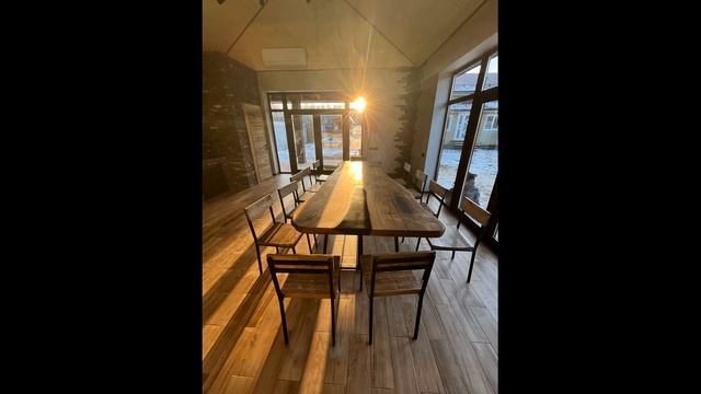 Огромный дубовый стол из слэба и эпоксидной смолы в виде реки