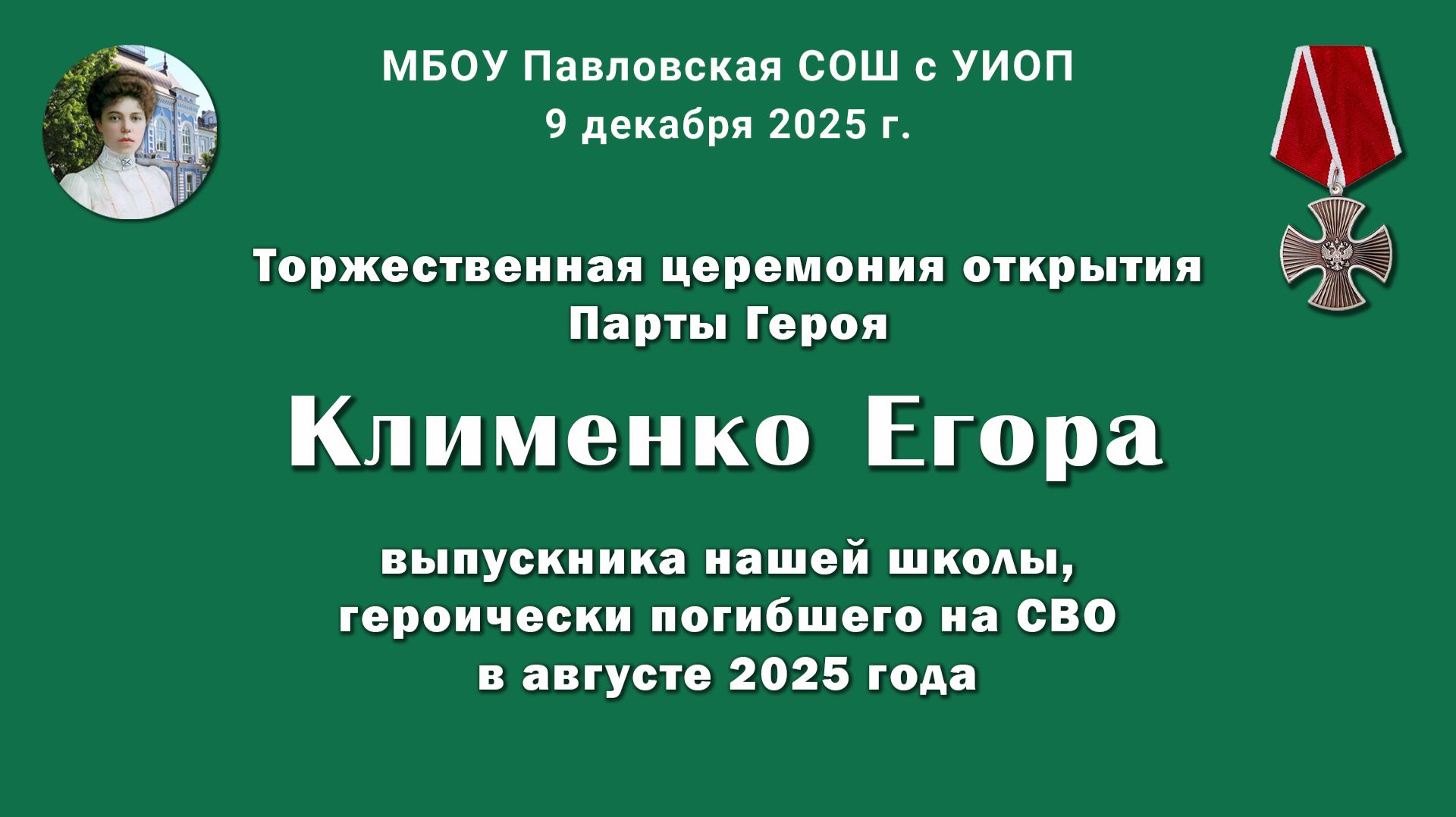 Видео о торжественной церемонии открытия Парты Героя - Клименко Егора, выпускника МБОУ Павловской СОШ с УИОП, погибшего на СВО в августе 2025 года