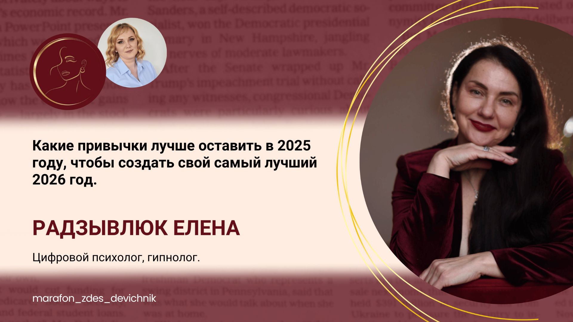 Запись эфира от Радзывлюк Елены, цифрового психолога, гипнолога. "Какие привычки лучше оставить в 2025 году, чтобы создать свой самый лучший 2026 год". На эфире разобрали, какие привычки абсолютно не стоит брать с собой в 2026 год! Ведь 2026 – это время новых планов и колоссальных возможностей, а старый "багаж" нам здесь точно не нужен. Канал в телеграм Радзывлюк Елены https://t.me/RADLEN0399 Канал марафона ЖЕНСКИЙ КЛУБ https://t.me/marafon_zdes_devichnik Организатор марафона ЖЕНСКИЙ КЛУБ https://t.me/permyakova_smm #коуч #психолог #семья #годсемьи #мужижена #отношения #консультация #мужчина #женщина #сексолог #нумеролог #хроникиакаши #нумерология #чтоговорятцифры #женскаяэнергия #ресурс #любовь #отношения #любовныеотношения #счастливывместе #имысчастливы #самооценка #любовьксебе #успех #жизнь #финансы #деньги #доход #расстановки #нутрициолог #зож #похуде #яхудею #старение #молодость