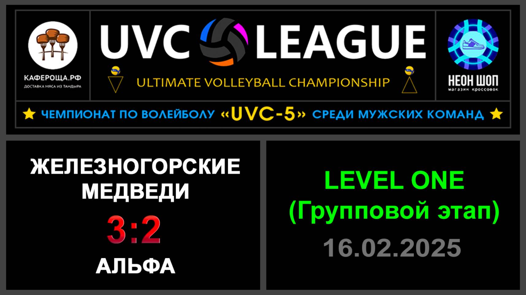 UVC-5 (Мужчины): Чемпионат UVC Лиги по волейболу среди мужских команд, 2024-2025 гг. Результаты игры: LEVEL ONE (Групповой этап) 16.02.2025 Железногорские медведи - Альфа 3:2 (26:28, 25:16, 25:16, 24:26, 15:9) Мужики тоже решили сыграть на все деньги, порубились на славу, Железка одержала верх! #UVC_ЛИГА_ЧЕМПИОНАТ_UVC_5_Мужчины