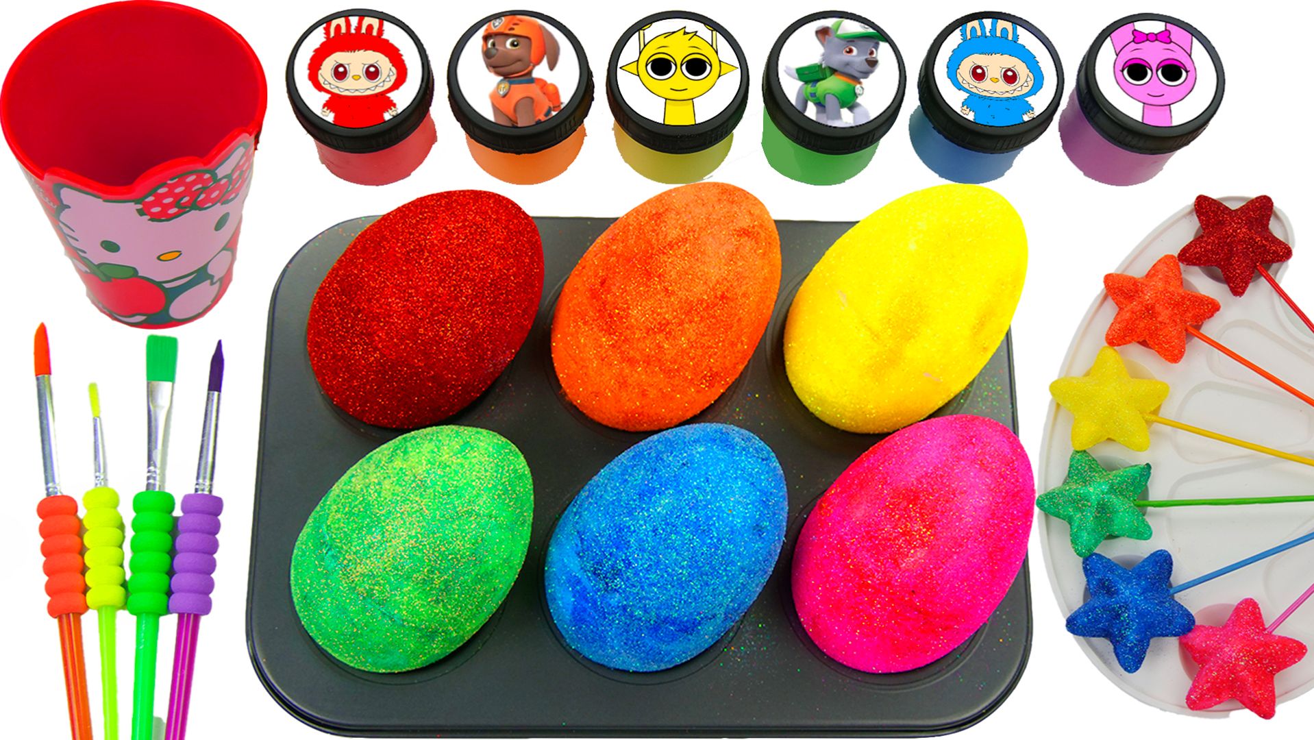 Видео о том как сделать 6 цветных блестящих яиц из звёздных леденцов в блёстках