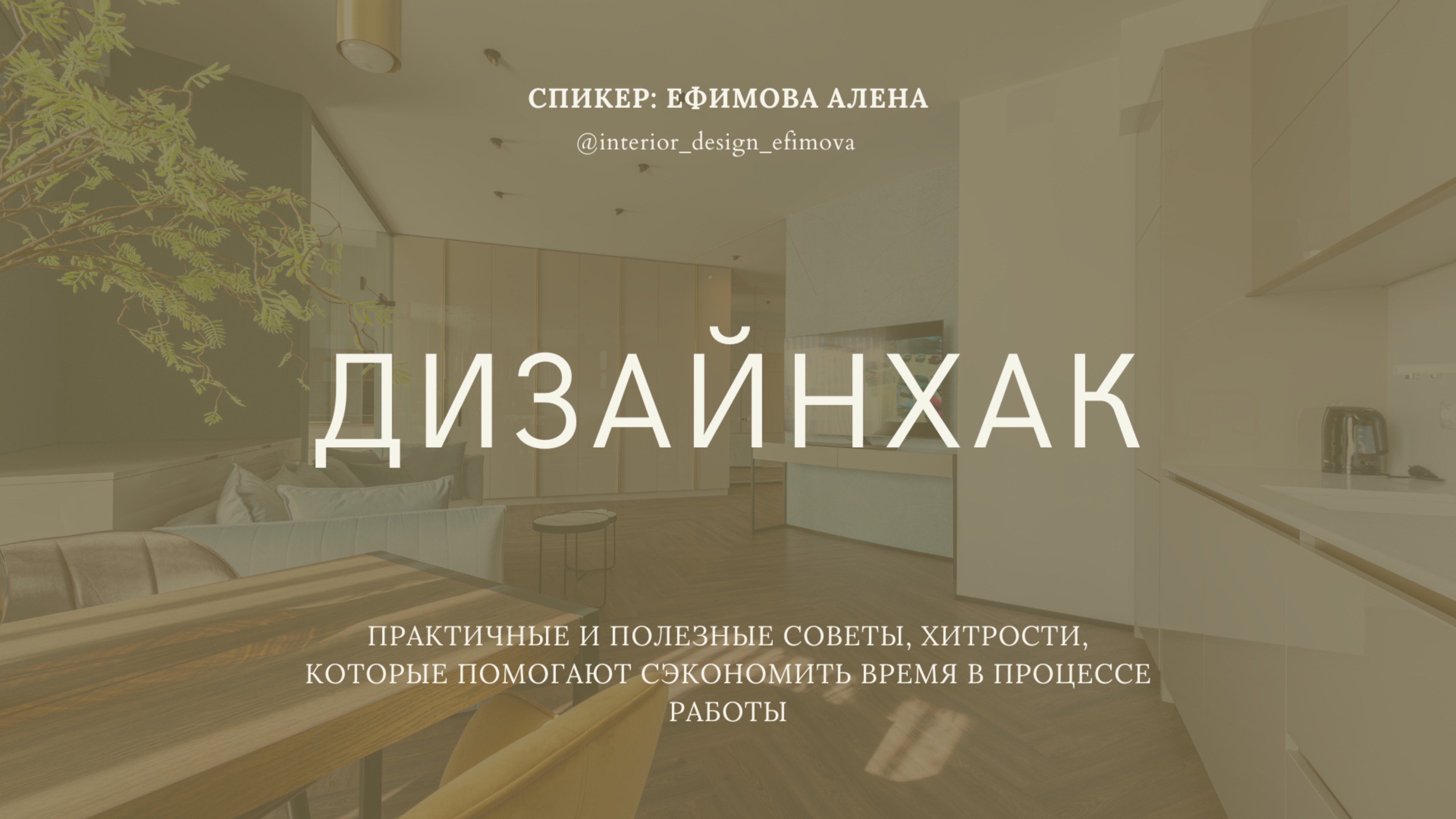 Ефимова Алена- практикующий дизайнер интерьеров: Два высших образования: инженер-строитель и дизайнер Более 95 реализованных объектов 3 года проработала куратором в онлайн школе Проверила 17 000 домашних заданий Провожу МК и вебинары для дизайнеров Индивидуальные консультации Дизайн-клуб Мое портфолио @interior_design_efimova Моя группа в телеграмм для дизайнеров https://t.me/archi_pro100 Группа в вк https://vk.com/club230295915