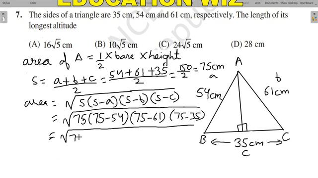 The sides of a triangle are 35 cm, 54 cm and 61 cm, respectively. The length of its longest altitude (A) 16 sqrt 5 cm (B) 10 sqrt 5 cm (C) 24 sqrt 5 cm (D) 28 cm Class 9 Mathematics NCERT exemplar problem chapter 12 ex 12.1 Q 7