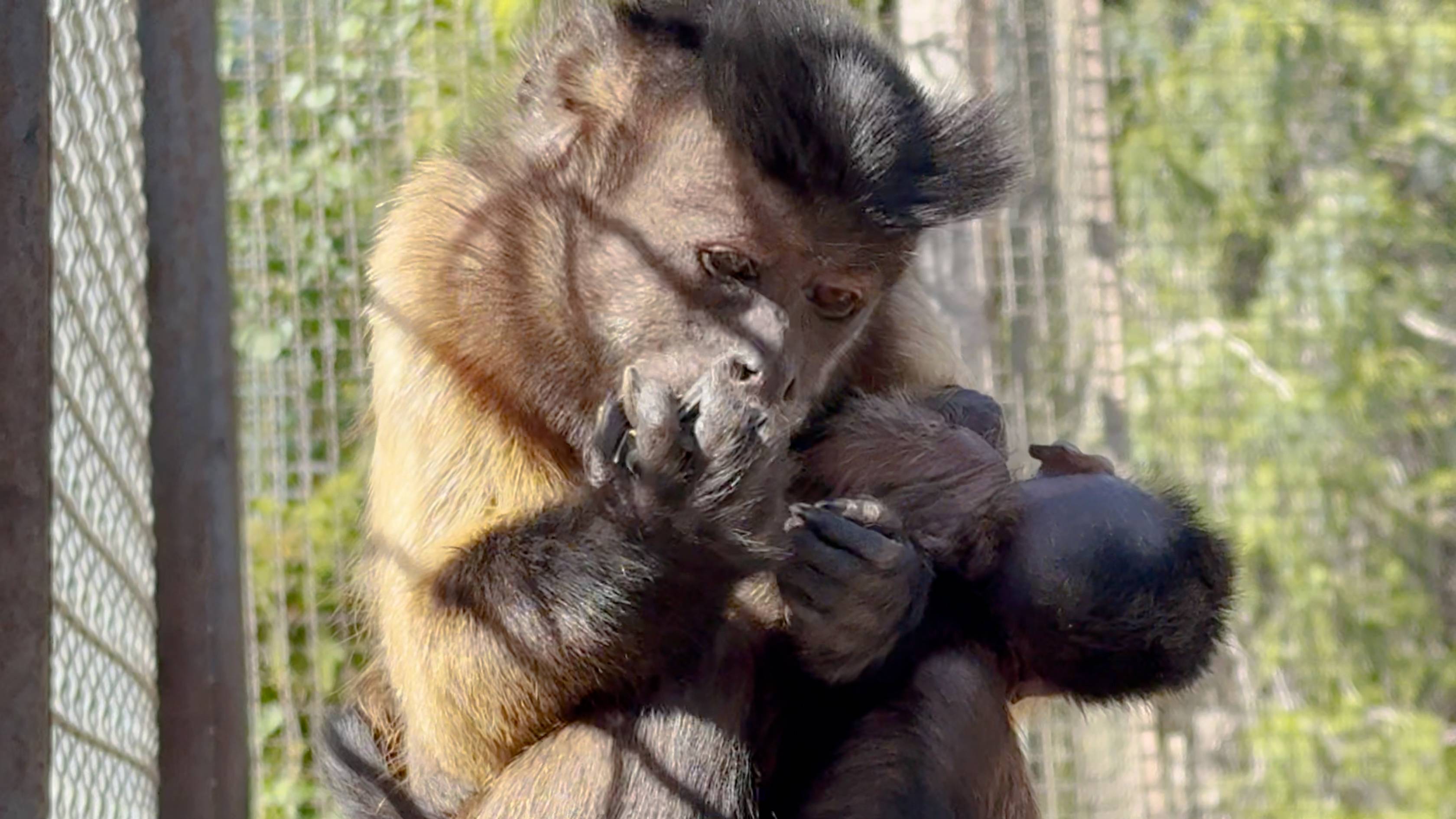 Пугаются все, кто видит - малыш капуцин слаб, мать носит его как вещь. Он все же жив, набирается сил