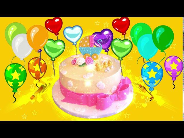 Детский футаж С ДНЁМ РОЖДЕНИЯ. ТОРТ в окружении воздушных шариков на золотом фоне