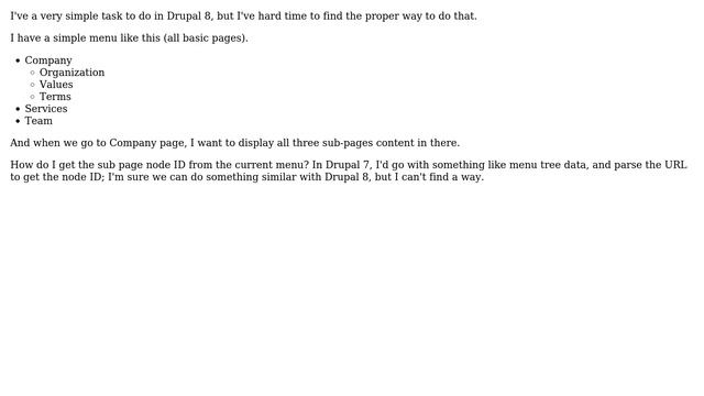 Drupal: How the get all the child menu's Node IDs? Helpful? Please support me on Patreon: https://www.patreon.com/roelvandepaar With thanks & praise to God, and with thanks to the many people who have made this project possible! | Content (except music & images) licensed under CC BY-SA https://meta.stackexchange.com/help/licensing | Music: https://www.bensound.com/licensing | Images: https://stocksnap.io/license & others | With thanks to user Serge Pesse (drupal.stackexchange.com/users/16490), user No Sssweat (drupal.stackexchange.com/users/27710), user Dylan (drupal.stackexchange.com/users/27223), and the Stack Exchange Network (drupal.stackexchange.com/questions/200352). Trademarks are property of their respective owners. Disclaimer: All information is provided "AS IS" without warranty of any kind. You are responsible for your own actions. Please contact me if anything is amiss at Roel D.OT VandePaar A.T gmail.com