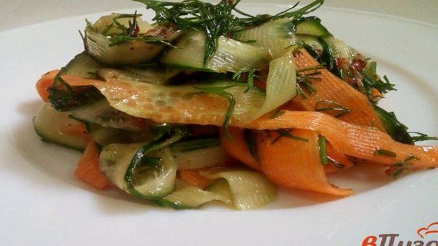 Простая, но благодаря тончайшей нарезке и пряной заправке необыкновенно ароматная, сочная и оригинальная закуска. Лучше сразу делать порцию побольше, потому что чем дольше этот салатик настаивается в холодильнике, тем вкуснее становится. Однако долго настаиваться ему не дадут, съедается он мгновенно. Ингредиенты: Морковь - 2 шт., Огурец - 2 шт., Масло растительное - 4-5 ст. л., Соевый соус - 2 ст. л., Сок лимонный - 2 ст. л., Сахар - 2 ч. л., Чеснок - 2 зуб., Перец черный - пол. ч. л., Перец красный жгучий - пол. ч. л., Соль - по вкусу, Благодарим за просмотр! Подписывайтесь на канал🍕 Поделитесь своим мнениенм о рецепте в комментариях!