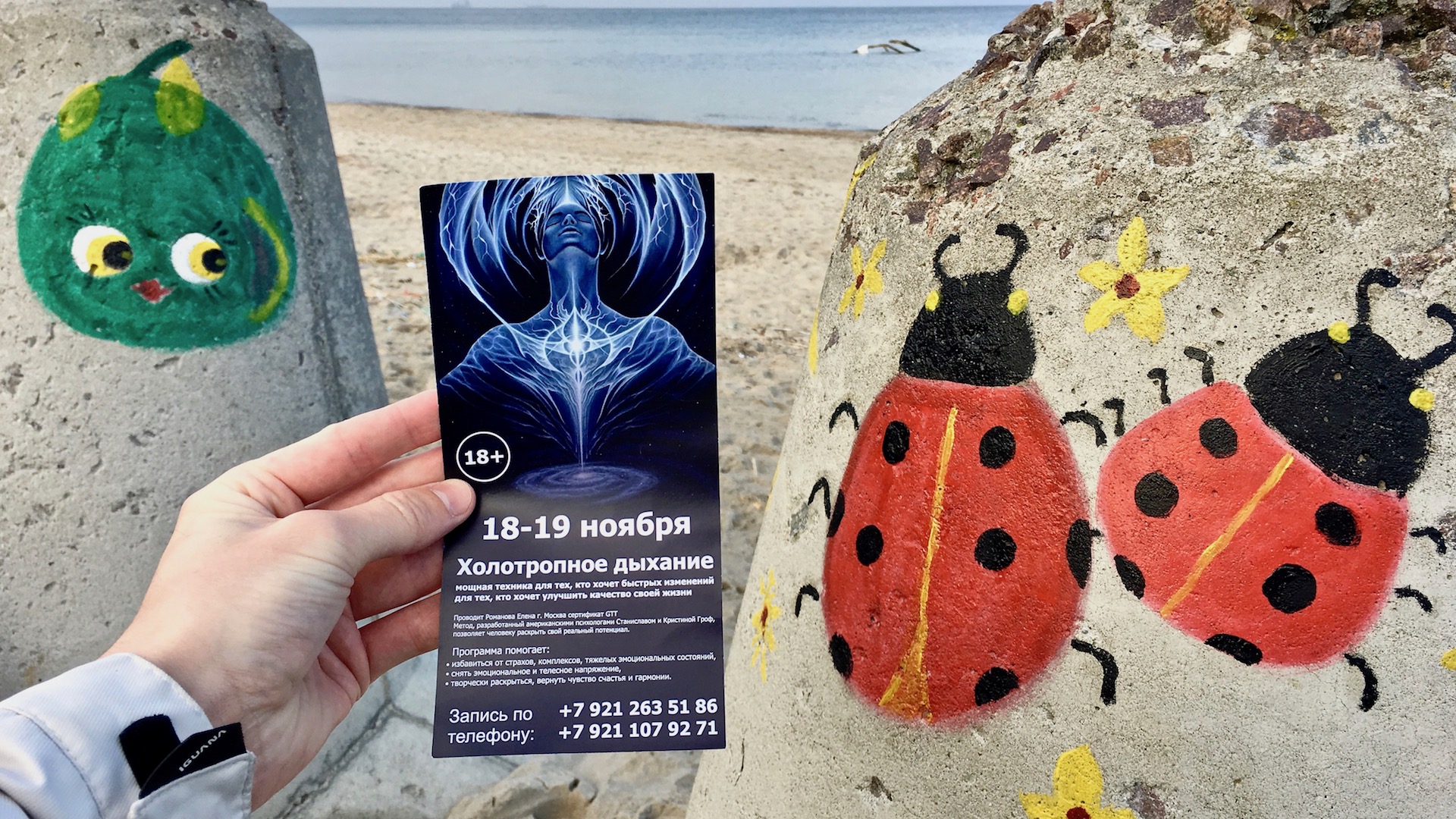 Листовку о холотропном дыхании Грофа я получил в Парке Скульптуры на острове Канта (Кнайпхоф) неподалёку от Кафедрального собора. Идеальное стартовое событие, чтобы замолотить видео про Демчога, холотропку, мистера Фримана, Виктора Пелевина и эзотерическую тусовку советского ибн постсоветского пространства русской саньясы.