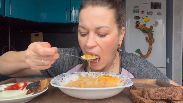 МУКБАНГ ЩИ С СВЕЖЕЙ КАПУСТОЙ/САЛО/ШАШЛЫК/ ГРЕНКИ/MUKBANG ЕДА ОБЖОР