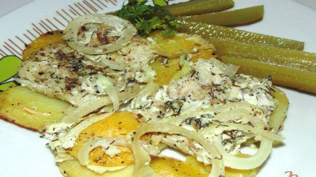 Хек запеченный в сметане с картофелем