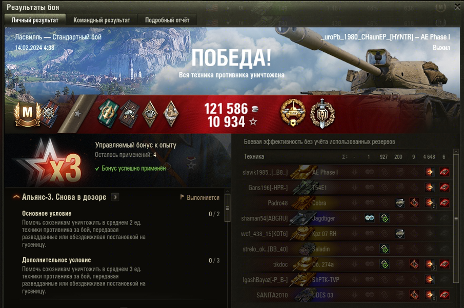 ЛАСВИЛЛЬ МАСТЕР на AE Phase I ОПЫТ: 1313 СУММАРНЫЙ УРОН: 5575 медаль КАЛИБР и ВОИН