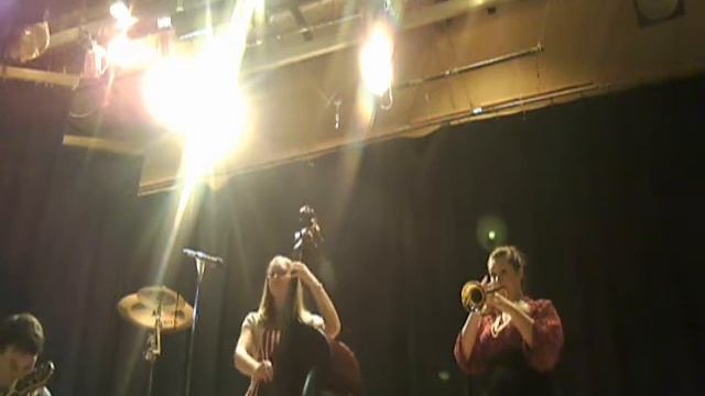 Jen Hodge All Stars playing at the UBC Swing Kids End of Summer Social in the UBC Ballroom. Bonnie Northgraves, trumpet & vocals! Evan Arntzen, clarinet & vocals! Josh Roberts, guitar and banjo! and Jen Hodge, bass, vocals & cymbals!